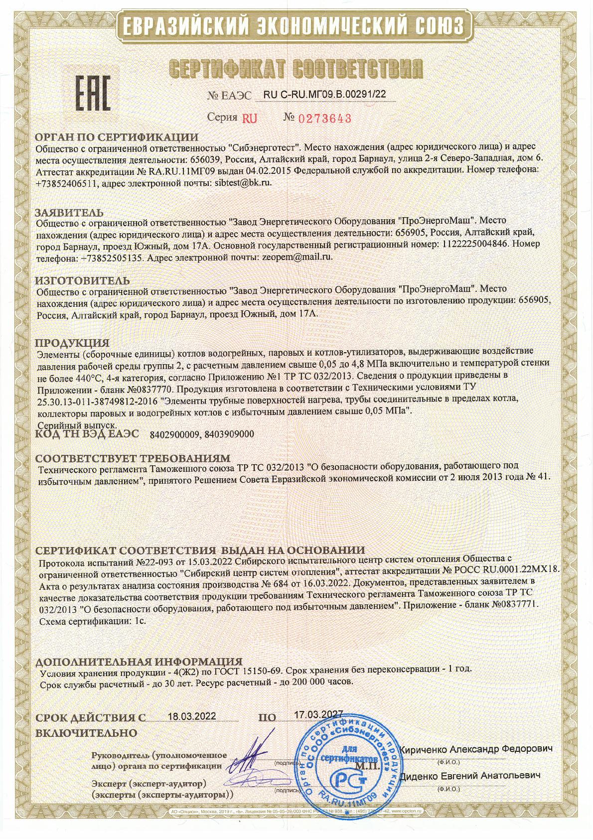 ЕАЭС № RU С-RU.МГ09.В.00291/22 от 18.03.2022. Действителен до 17.03.2027.
