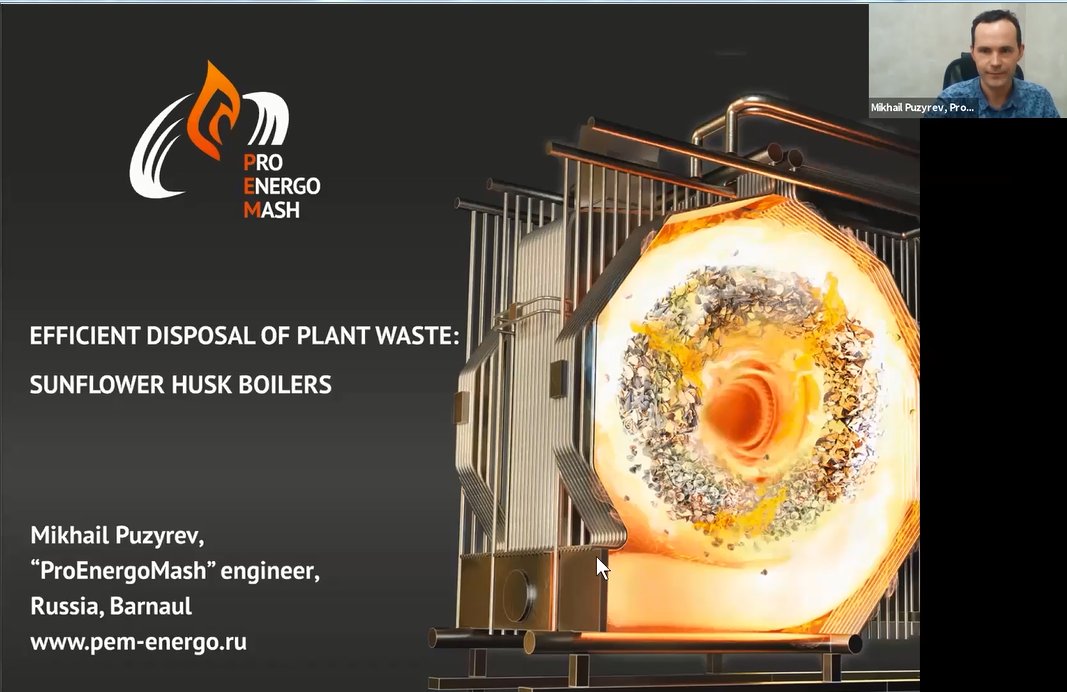 В качестве эксперта компании «ПроЭнергоМаш» выступил Пузырев Михаил, кандидат технических наук, ведущий инженер, руководитель группы по разработке специализированного котельно-топочного оборудования. Михаил представил заинтересованной аудитории доклад СОт отходов к энергии: утилизация лузги подсолнечника», в ходе которого озвучил не только одну из проблем при производстве подсолнечного масла – образование большого количества лузги, накопление которой создает серьезные экологические и экономические вызовы для предприятий, но и особенности самой лузги как топлива. Также ознакомил участников конференции с комплексными решениями данных проблем, которые предлагает «ПроЭнергоМаш», ключевой разработкой компании – вихревой технологией сжигания «Торнадо», доказавшей свою эффективность при работе с легкими парусными отходами, внедрение которой позволяет обеспечить: ресурсосбережение; снизить экологическую нагрузку за счет отказа от ископаемых топлив и сокращения свалок; выработку тепла в виде пара с годовым экономическим эффектом до 5 млрд. руб./ год.